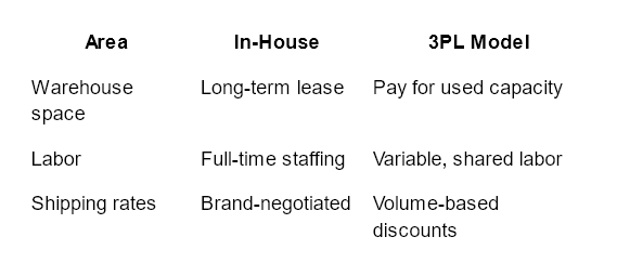 Running fulfillment in-house requires capital. Warehouses, material handling equipment, labor, and software all carry upfront and ongoing costs. Outsourcing converts many of these fixed expenses into variable ones tied to actual volume.