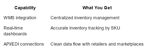 A 3PL connects your order management and sales channels to a warehouse management system (WMS). This technology integration delivers real-time inventory visibility across fulfillment centers, SKUs, and locations.